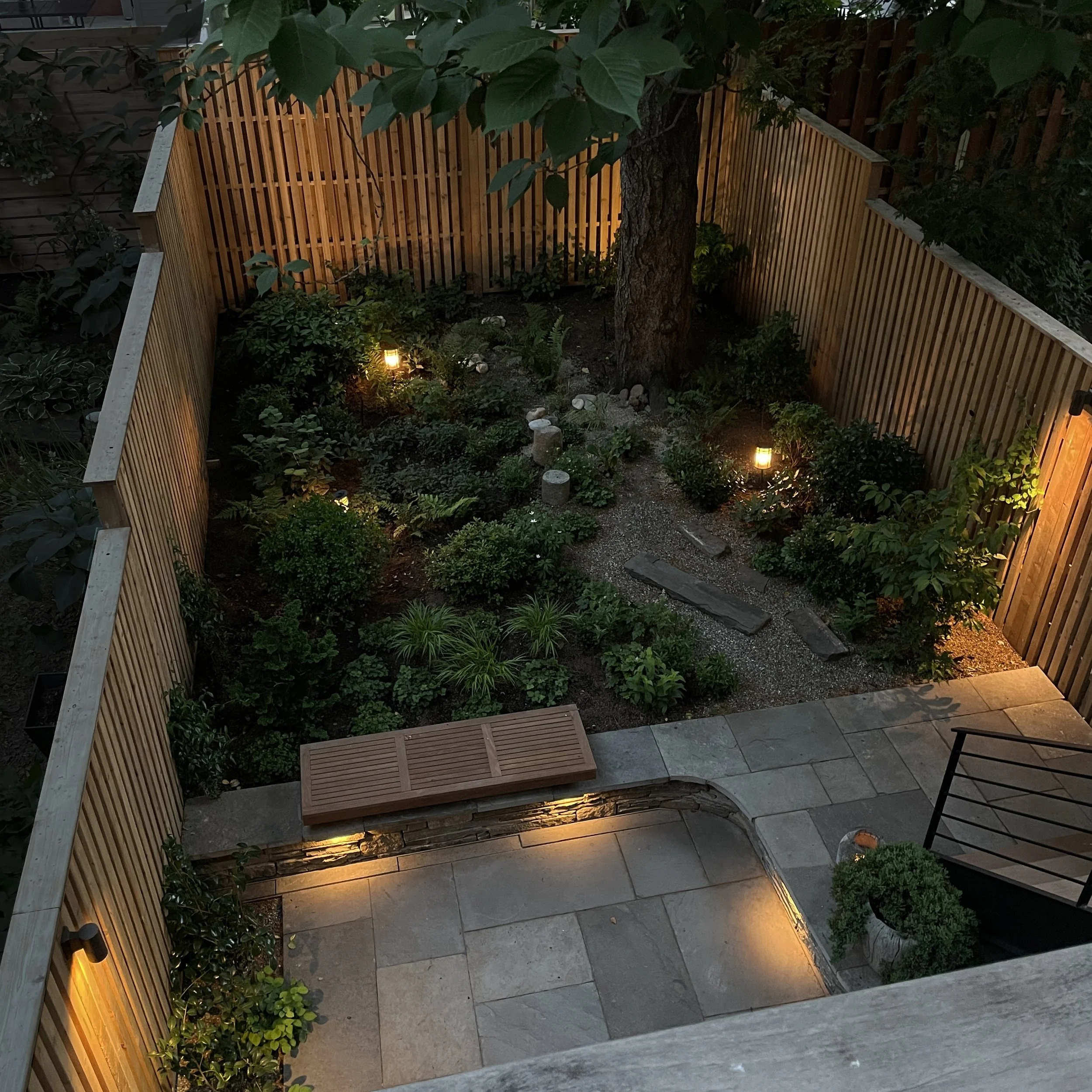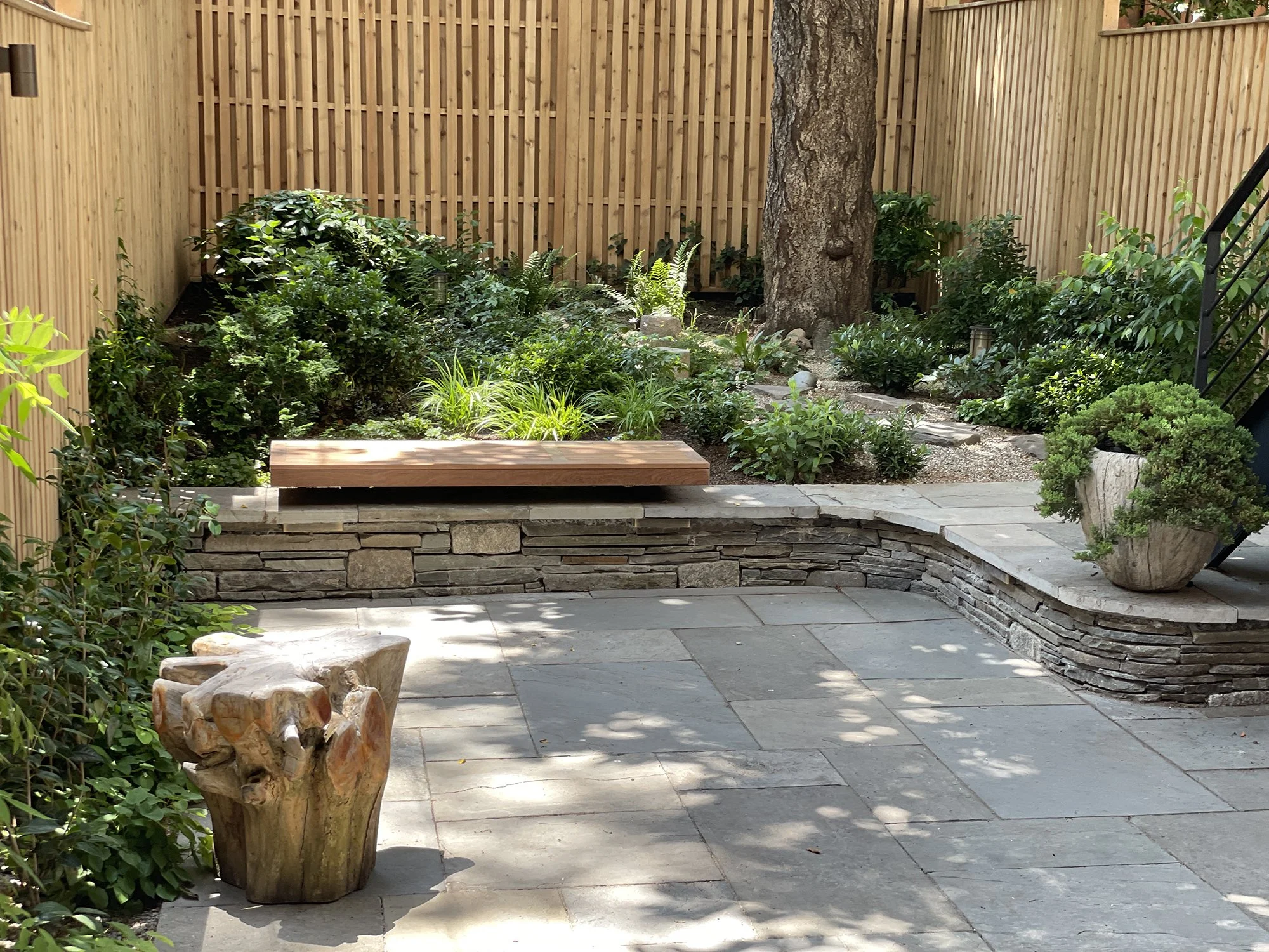 At the heart of this garden is a magnificent thirty year old flowering cherry which the clients say is also the heart of their home. For decades they have looked forward to it flowering each spring, when it showers everything in an ethereal snow of delicate pink blossoms. The garden was inspired by classic Japanese garden design but consideration was made to make it feel authentic in a Brooklyn townhouse setting. The garden’s design is centered around the sauna (not pictured) where the client after exiting can sit under the cherry on a floating bench and enjoy spring Camellia and Azalea blossoms and the scent of sweet Viburnum. The extensive root system of the mature tree and the deep shade it cast was a specific challenge in the planting design. An even greater challenge was in engineering the extensive storm drains and bi level patio without disturbing the roots of the tree but part and parcel of garden design in urban environments.