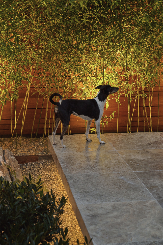This garden was designed to be a daily retreat for this couple’s busy life, a place to connect and disconnect throughout the day. The garden is one of the main features of the home; in full view through the floor to ceiling windows and doors that open to the terrace. Travertine platforms float above a plantscape of emerald textures that hugs the main seating area. 90% evergreen, this garden holds it’s beauty year round with the fiery autumn color of a specimen Japanese Maple and the sweet spring smell of Viburnum Carlesii announcing the seasons. Delicate Ferns, fringe-leaved Maple leaves, swaying bamboo and feathery grasses soften the minimalist design. A full, well-blanced lighting plan gives the garden a warm inviting glow whether enjoyed outside or seen from inside the home.